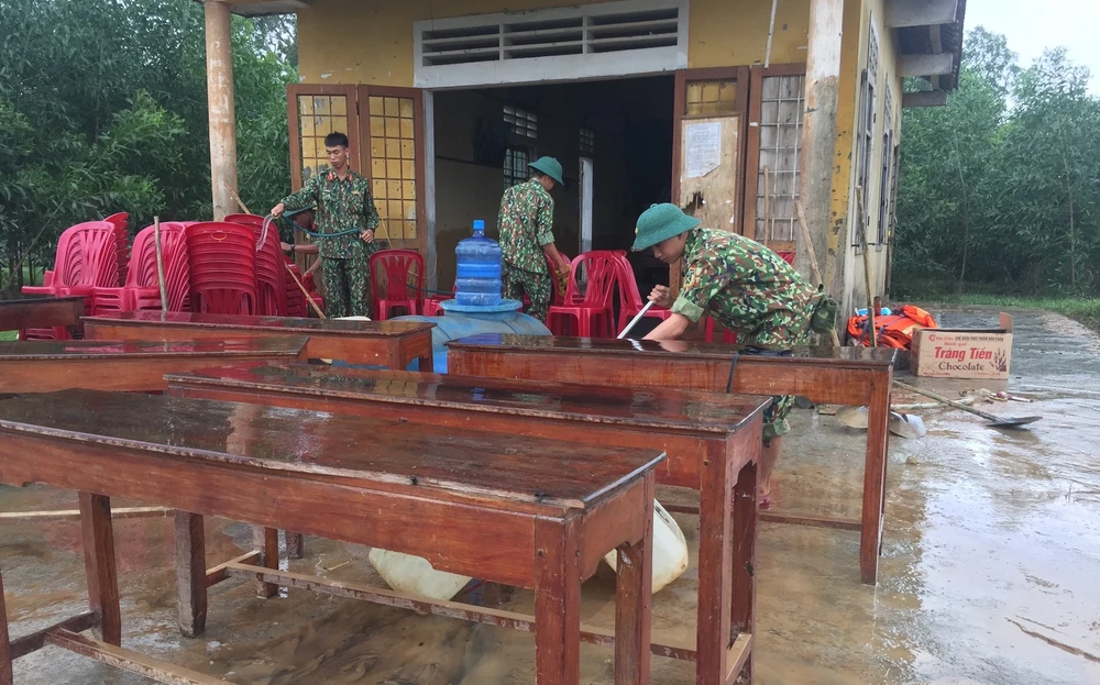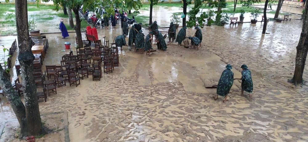 Cán bộ chiến sĩ Trung đoàn 19 đang dọn dẹp bùn đất để các em học sinh sớm quay trở lại trường học.