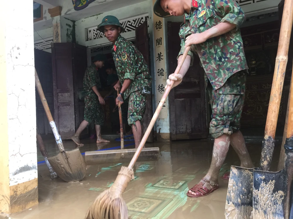 Nhà người dân nào cần đều được các anh giúp đỡ. Nước lũ rút đến đâu sẽ dọn sạch đến đó.