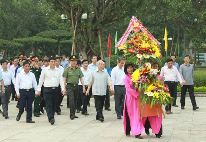 Chiều 28-10, ngay sau khi đến Nghệ An, Tổng Bí thư Nguyễn Phú Trọng đã đến dâng hương tại đền thờ Hoàng đế Quang Trung (trong Di tích Phượng Hoàng Trung Đô thuộc quần thể danh thắng cấp quốc gia núi Dũng Quyết và Phượng Hoàng Trung Đô, TP Vinh, Nghệ An).