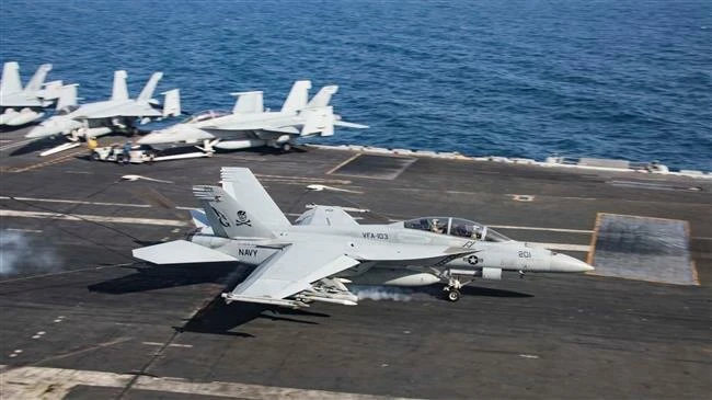Một chiếc Super Hornet F/A-18F hạ cánh trên boong máy bay của tàu sân bay lớp Nimitz của Hải quân Hoa Kỳ USS Abraham Lincoln ở Vịnh Oman, ngày 22-5 năm 2019. Ảnh: Reuters