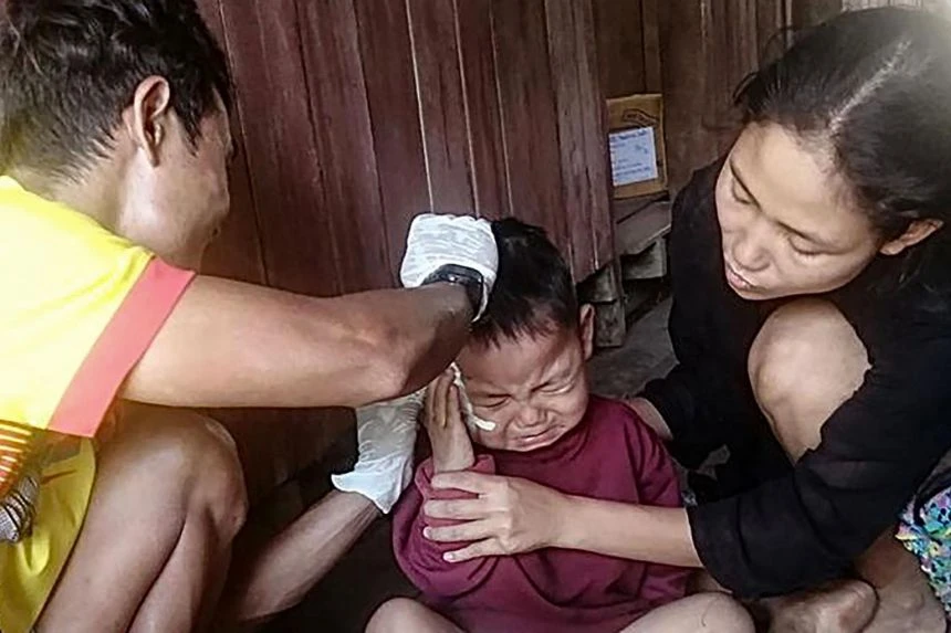 Một bé trai gần ba tuổi đã sống sót kỳ diệu trong cuộc không kích của quân đội Myanmar hồi cuối tuần qua gần biên giới với Thái Lan.