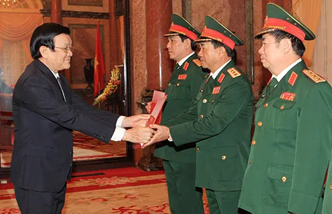 Chủ tịch nước Trương Tấn Sang trao quyết định thăng quân hàm thượng tướng cho các lãnh đạo Bộ Quốc phòng. Ảnh: TTXVN