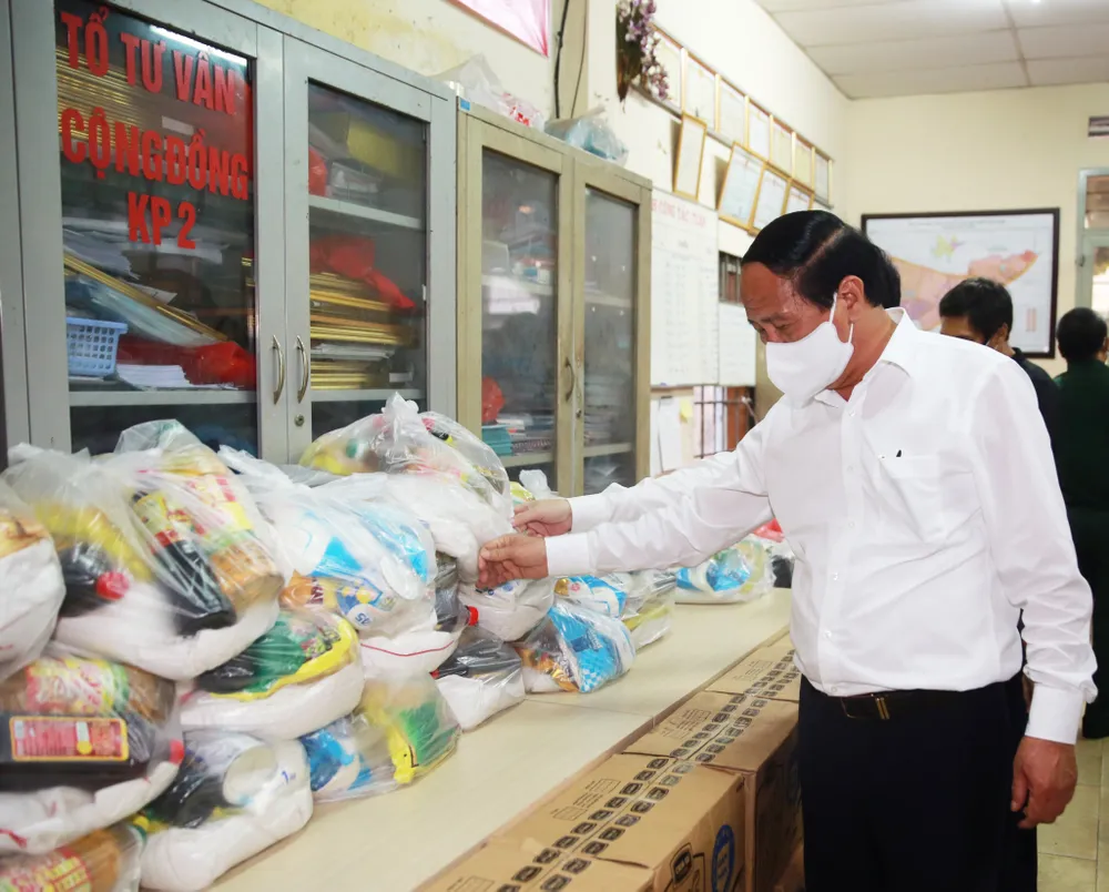 Phó Thủ tướng Lê Văn Thành kiểm tra nhu yếu phẩm chuẩn bị phát cho người dân. Ảnh: VGP