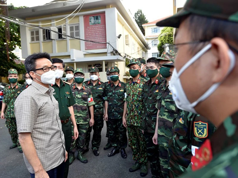 Phó Thủ tướng Vũ Đức Đam động viên các học viên Học viện Quân y vào chi viện cho các cơ sở điều trị, trạm y tế lưu động trên địa bàn quận Bình Thạnh (TP.HCM) ngày 22-8. Ảnh: VGP