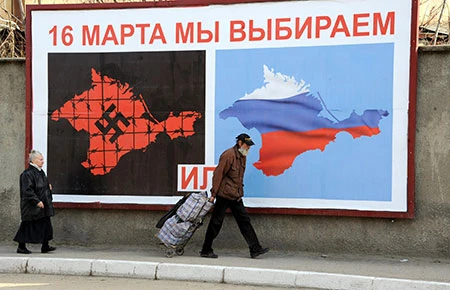 Bảng cổ động tham gia trưng cầu dân ý ngày 16-3 ở Crimea (được vẽ bằng màu cờ Nga). Ảnh: AP