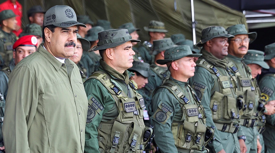 Tổng thống Venezuela Nicolas Maduro (ngoài cùng bên trái) kêu gọi quân đội sẵn sàng bảo vệ đất nước trước đe dọa từ Mỹ. Ảnh: RT