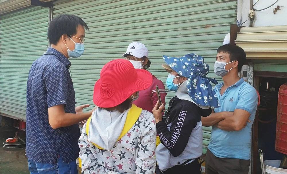 Sáng ngày, ông Nguyễn Thế Dũng, Chủ tịch UBND phường 14 (bìa trái) cùng tổ công tác đến khu chợ tự phát Thạch Đà để vận động bà con dừng việc tụ tập buôn bán. Ảnh NT