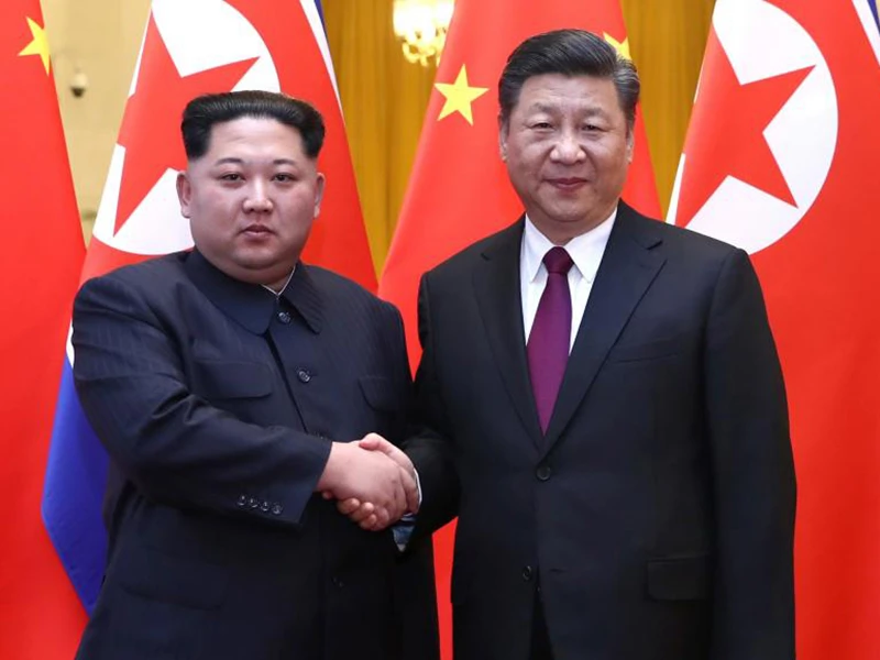 Lãnh đạo Triều Tiên Kim Jong-un (trái) và Chủ tịch Trung Quốc Tập Cận Bình tại Bắc Kinh. Ảnh: TÂN HOA XÃ