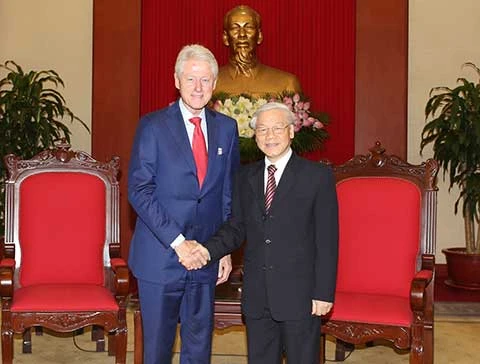 Ngày 2-7 vừa qua, tại Hà Nội, Tổng bí thư Nguyễn Phú Trọng tiếp cựu Tổng thống Mỹ Bill Clinton, người đã tuyên bố bình thường hóa quan hệ ngoại giao với Việt Nam 20 năm trước (11-7-1995). Ảnh: TTXVN