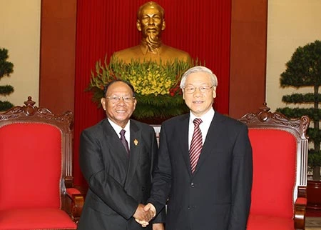 Tổng Bí thư Nguyễn Phú Trọng tiếp Chủ tịch Quốc hội Vương quốc Campuchia Samdech Heng Samrin. Ảnh: TTXVN