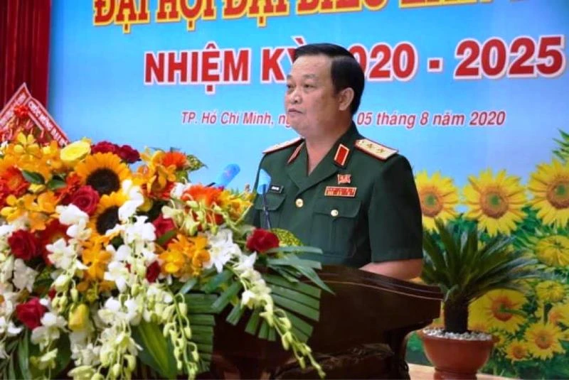 Trung tướng Trần Hoài Trung, Bí thư Đảng ủy, Chính ủy Quân khu 7, phát biểu khai mạc đại hội. Ảnh: P.ĐIỀN