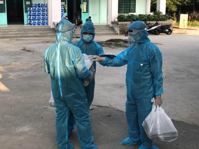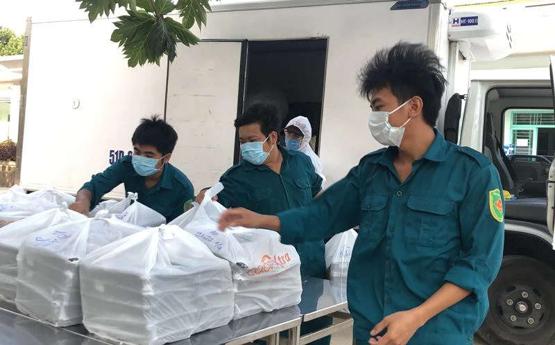 Lực lượng dân quân tự vệ tổ chức đưa cơm tận phòng người cách ly tại Trung tâm Giáo dục quốc phòng và an ninh - ĐH Quốc gia TP.HCM. Ảnh: P.ĐIỀN