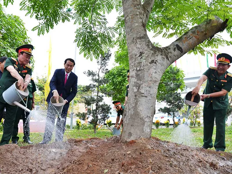 Chủ tịch nước Trần Đại Quang và Thượng tướng Trần Đơn, Thứ trưởng Bộ Quốc phòng, trồng cây lưu niệm tại Bộ Tư lệnh Quân khu 9. Ảnh: H.ĐƯỜNG