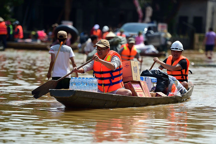Các nhóm thiện nguyện chèo thuyền đưa lương thực hỗ trợ người dân bị lũ lụt ở miền Trung hồi tháng 10-2020. Ảnh: A.TÙNG