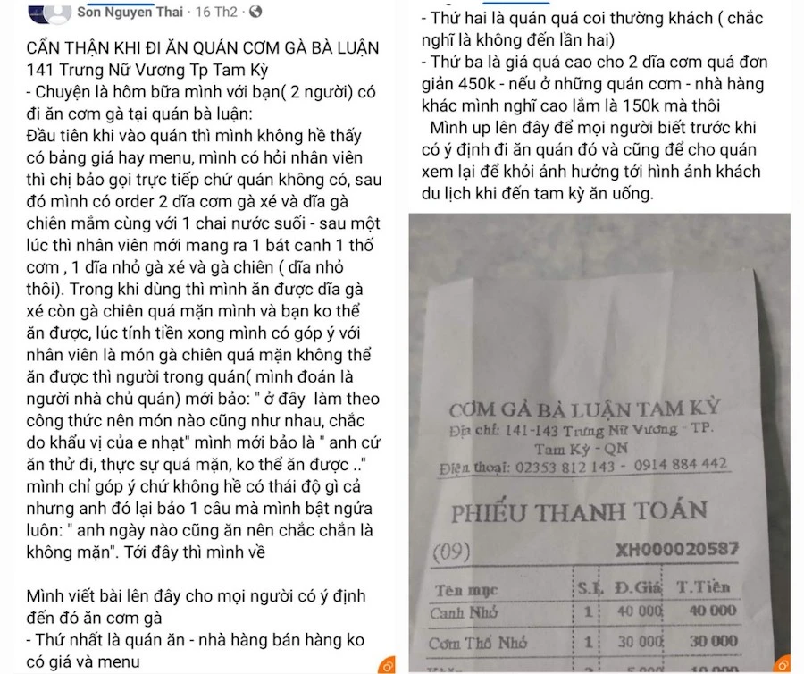 Trước đó, nhiều tài khoản facebook đăng tải các bài viết về quán cơm gà Bà Luận (cơ sở 141-143, đường Trưng Nữ Vương, TP Tam Kỳ, Quảng Nam) cho rằng giá cao nhiều hơn so với những quá khác. Bên cạnh đó, quán không niêm yết giá rõ ràng.