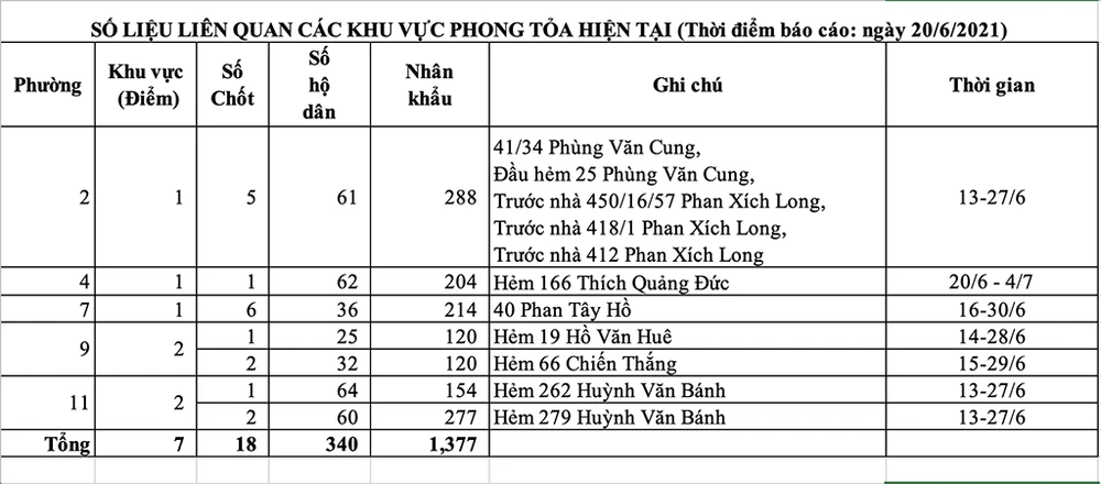Theo báo cáo, quận Phú Nhuận có tổng cộng 17 khu vực phong toả tại chín phường với 1.103 hộ dân và 4.149 nhân khẩu; có 43 chốt phong toả được bố trí ở các khu vực này.