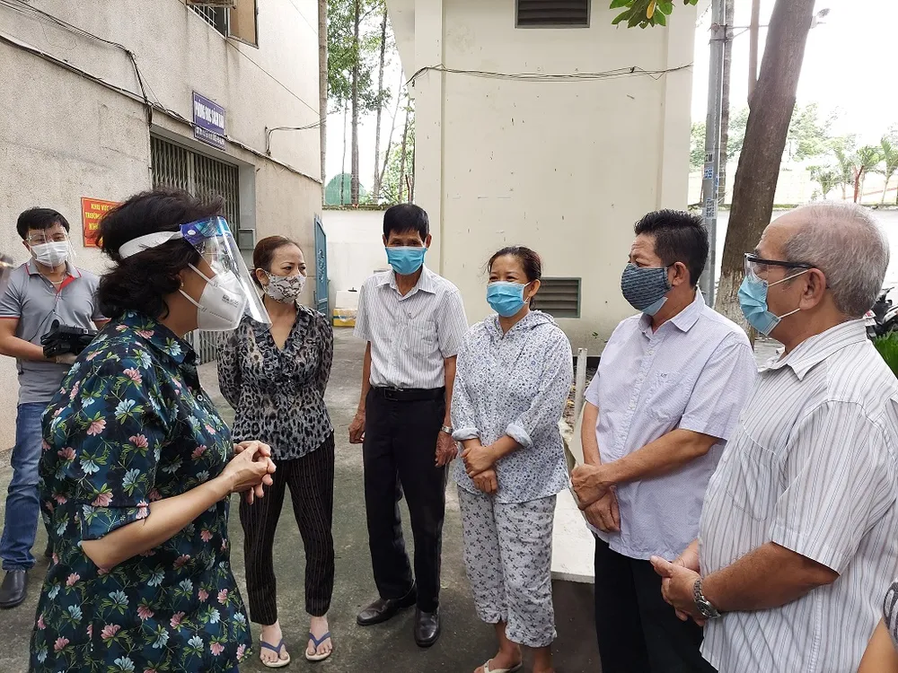 Chủ tịch Ủy ban MTTQ Việt Nam TP.HCM Tô Thị Bích Châu (góc phải ảnh) kiểm tra công tác phòng, chống dịch tại các khu cách ly, phong tỏa tại quận Phú Nhuận. Ảnh: MTTQ TP.HCM