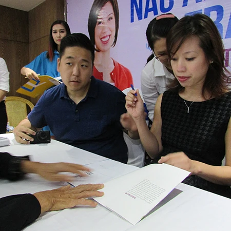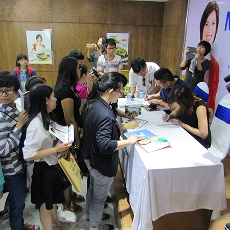 Tại buổi giao lưu, rất đông khán giả hâm mộ đã kiên nhẫn xếp hàng chờ được quán quân cuộc thi Master Chef USA mùa thứ 3 Christine Hà ký tặng quyển sách nấu ăn của cô vừa được dịch sang tiếng Việt để xuất bản.