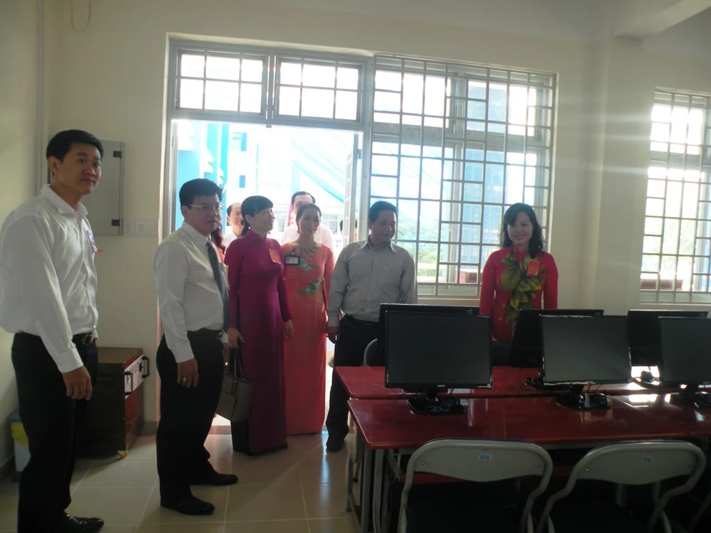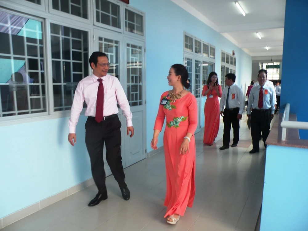 Ông Lê Hoài Nam, Phó Giám đốc Sở GD&ĐT, cùng các sở, ban ngành đi tham quan ngôi trường mới.