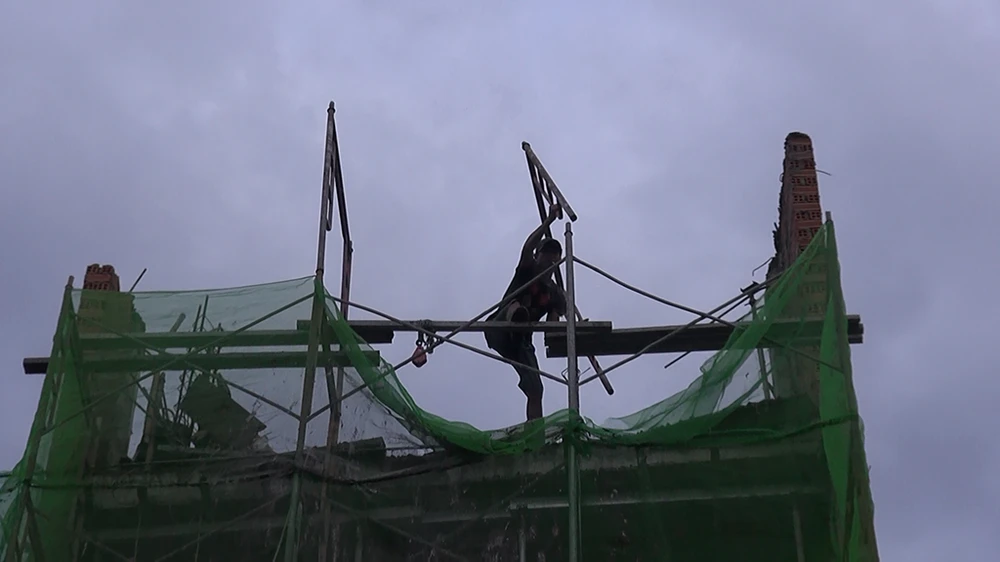 Đến cuối giờ chiều, một người đàn ông vẫn đứng trên lầu ba công trình để lắp lại giàn giáo. Ảnh NT.