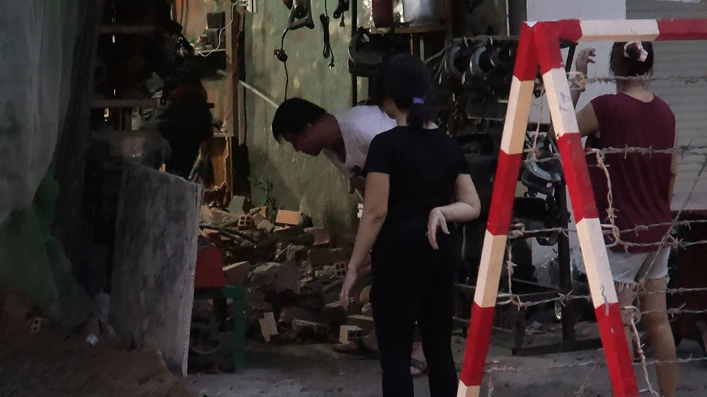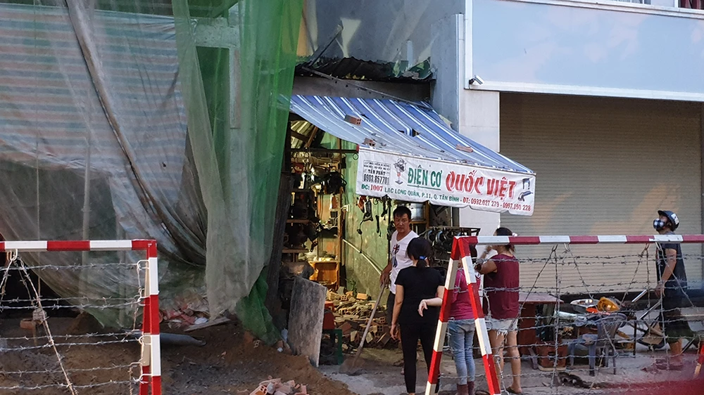 Gạch vữa đổ xuống tiệm điện cơ bên cạnh công trình. Ảnh NT.