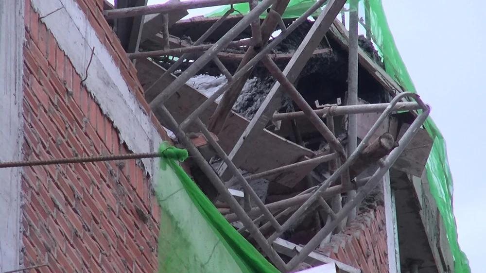 Nhiều phần tường, giàn giáo... bị đổ sập ở công trình đang xây dựng. Ảnh NT.