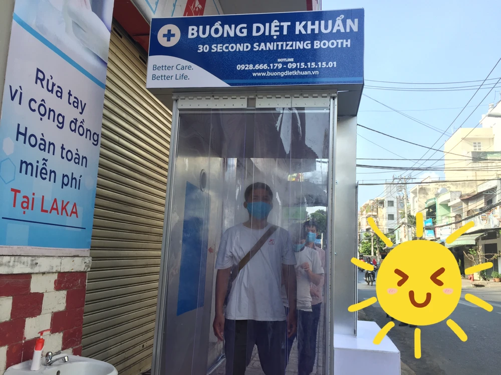 Chiều 26-3, tại 37 Quách Đình Bảo, phường Phú Thạnh, quận Tân Phú, TP.HCM, người dân vui vẻ khi lần đầu được trải nghiệm chống dịch COVID-19 trong buồng diệt khuẩn di động.