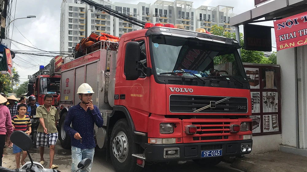 Thanh niên này liên tục la hét khiến mọi người hoảng sợ. Cảnh sát PCCC quận 9 phải điều một xe cứu hộ và một xe thang cùng nhiều cán bộ, chiến sĩ đến hiện trường.