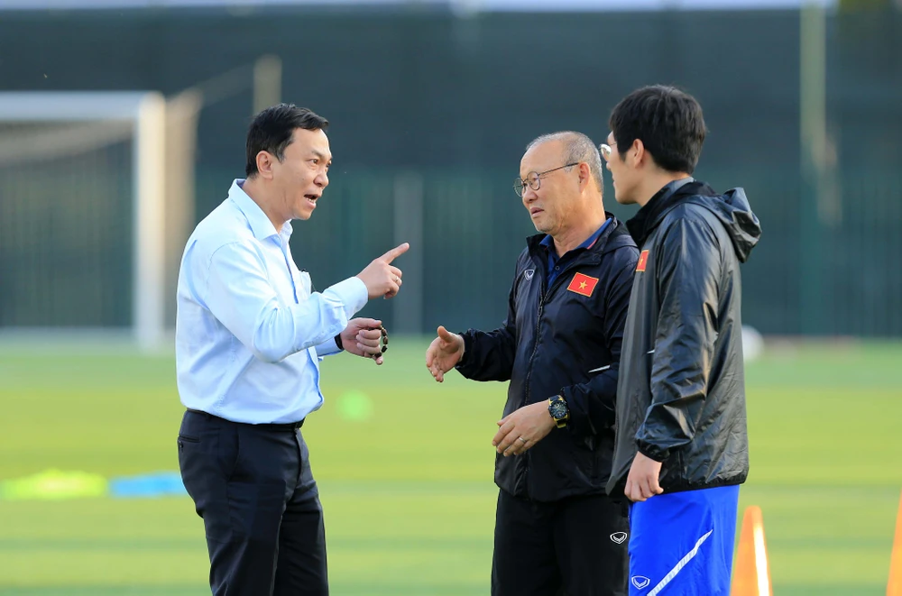 Phó Chủ tịch VFF Trần Quốc Tuấn thông báo tin vui với thầy Park. ẢNH: NGỌC DUNG