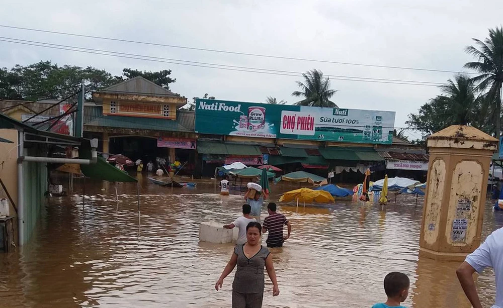 Chợ phiên tại thị trấn Cam Lộ (Quảng Trị) bị ngập sâu trong nước lũ. Ảnh: Nguyễn Thị Thanh