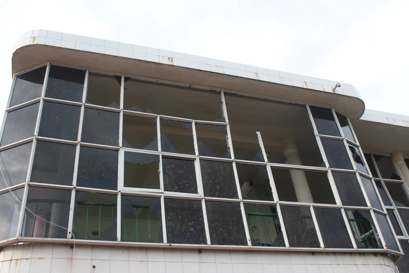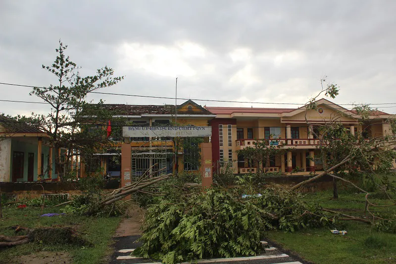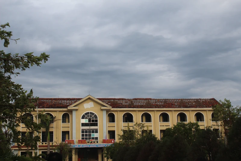 Cơn bão số 10 đã khiến nhiều công sở, trường học tại Quảng Bình bị hư hỏng. Ảnh: Hệ thống cửa kính, mái ngói của Trường THPT Quang Trung bị hư hỏng nghiêm trọng.