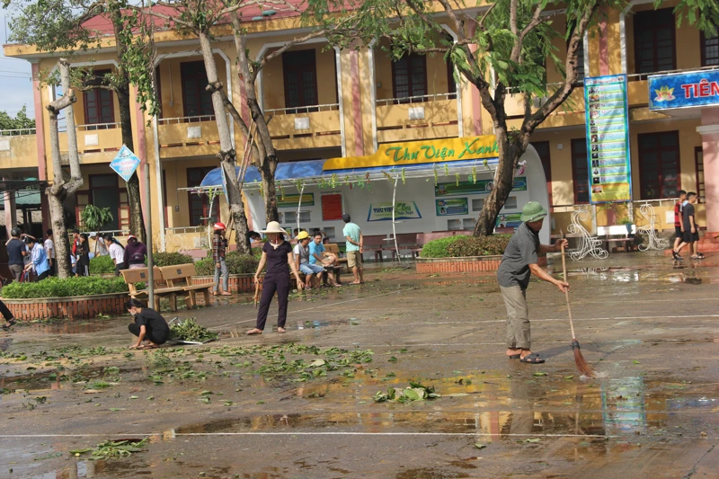 Thầy trò Trường THCS Nguyễn Hàm Ninh (TX Ba Đồn) dọn dẹp vệ sinh. Giáo viên ở đây cho biết vào thứ Hai ngày 18-9 các lớp học sẽ hoạt động trở lại sau gián đoạn bởi mưa bão.