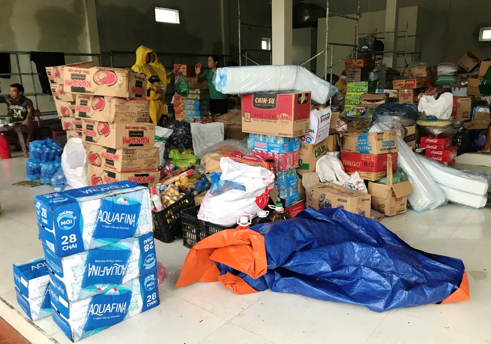 Hàng hóa tập kết tại xả Hương Thủy (huyện Lệ Thủy) chở được vận chuyển đến các vùng ngập lụt. Ảnh: HẢI HIẾU