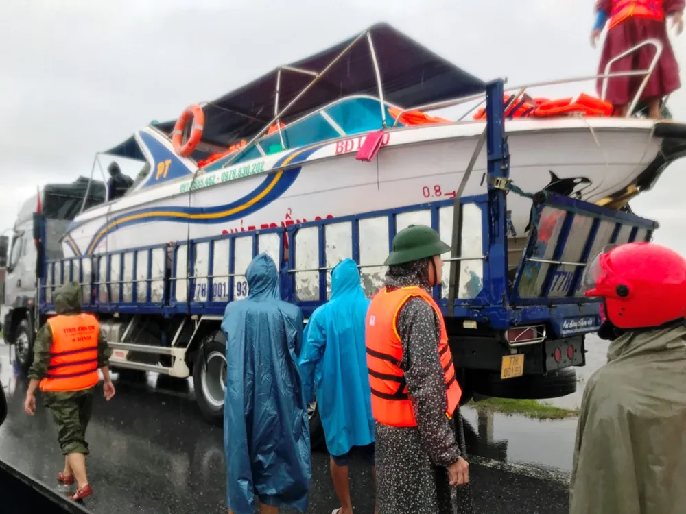 Một ca nô được xe tải vận chuyển từ Bình Định ra huyện Lệ Thủy hỗ trợ người dân. Ảnh: HẢI HIẾU