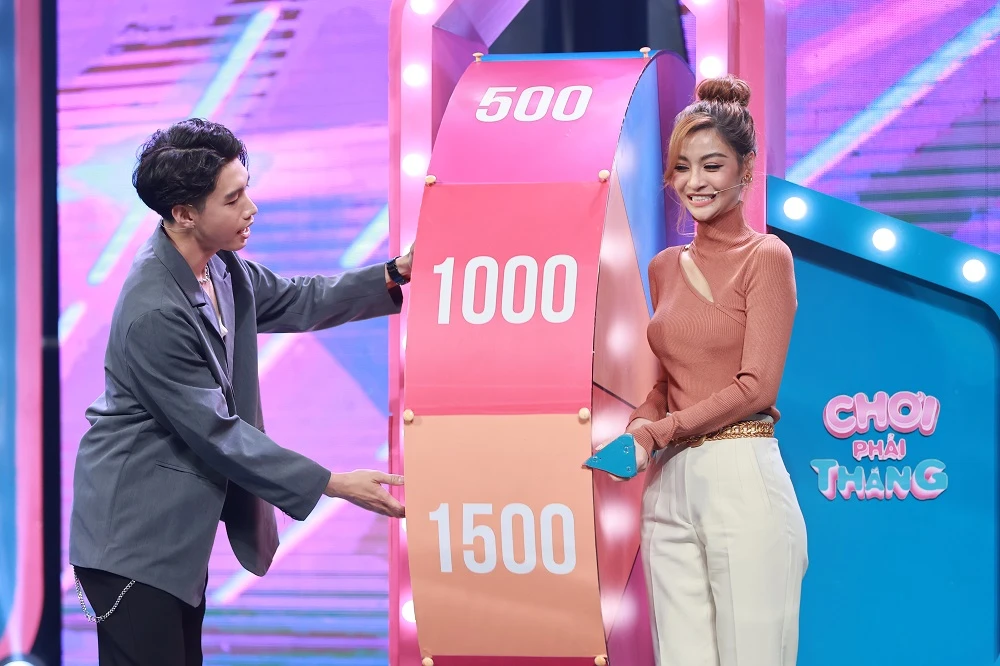 Đặc biệt trong màn quay thưởng, Kiều Loan còn lém lỉnh kéo nhẹ vòng quay từ ô năm 500 nghìn đồng lên ô 1,5 triệu đồng trong sự làm ngơ của MC Nguyên Khang.