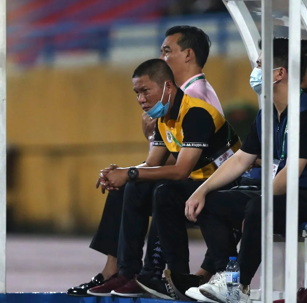 HLV Chu Đình Nghiêm không cần thiết phải đứng dậy chỉ đạo cầu thủ Hà Nội khi họ tạo ra thế trận áp đảo một chiều quá thoải mái.