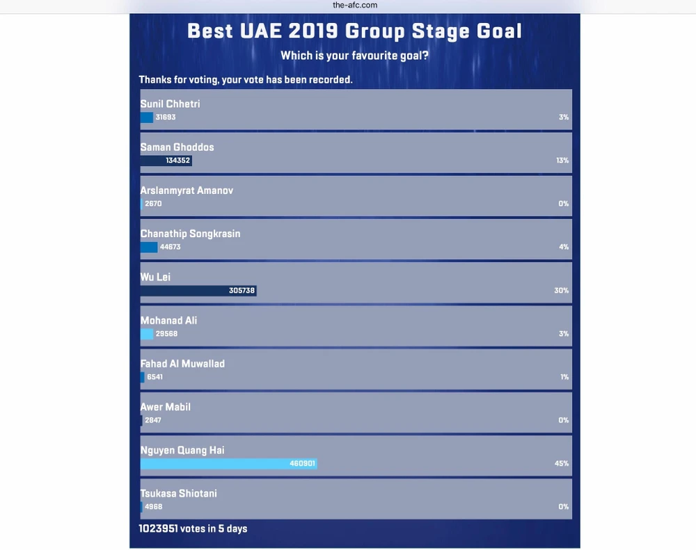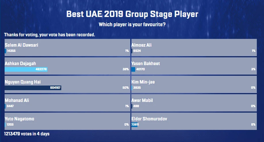 Quang Hải giành 604.167 phiếu (50%) trong khi người về thứ hai là Ashkan Dejagah (Iran) chỉ có 462.278 phiếu (38%). Đứng thứ ba là Yasen Bakheet (Jordan) có 40.170 phiếu, chiếm 3%. Đáng chú ý, vua phá lưới vòng bảng người Qatar, Almoez Ali ghi đến 7 bàn nhưng chỉ đứng thứ sáu với 6.624 phiếu (1%).