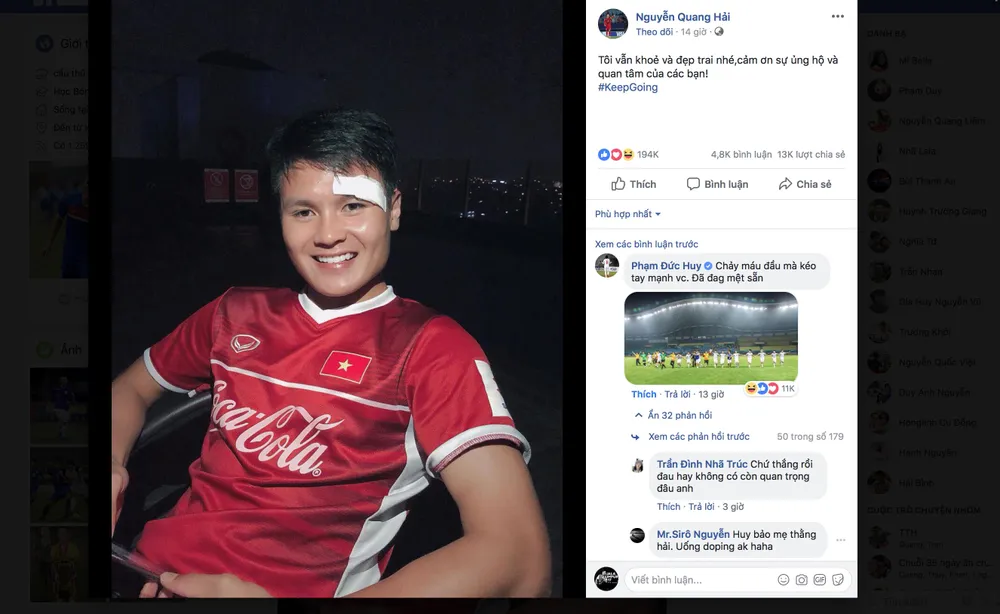 "Tôi vẫn khỏe và đẹp trai nhé, cảm ơn sự ủng hộ và quan tâm của các bạn!" - Quang Hải chia sẻ trên Facebook.