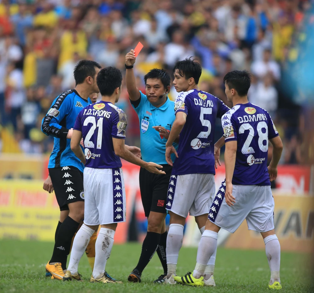 Trung vệ Đình Trọng bị thẻ đỏ trong cảnh dầu sôi lửa bỏng và Duy Mạnh chấn thương đã làm Hà Nội gãy nửa hàng thủ. Ảnh: NGỌC DUNG