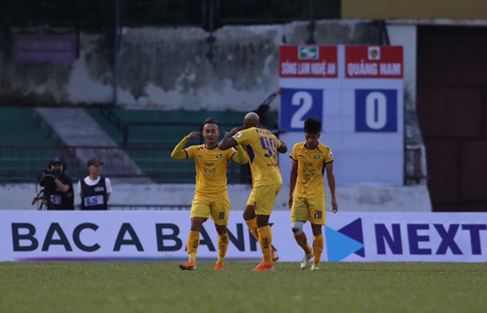 Tuấn Tài (trái) thi đấu nổi bật trong màu áo SL Nghệ An tại V-League 2020. Ảnh: VFF.