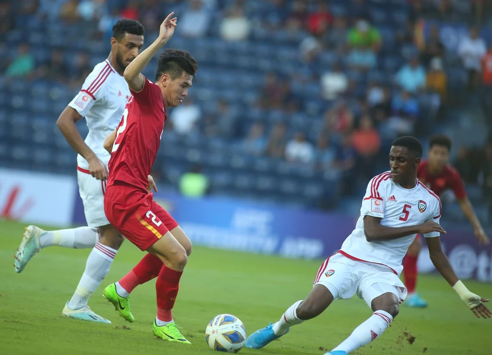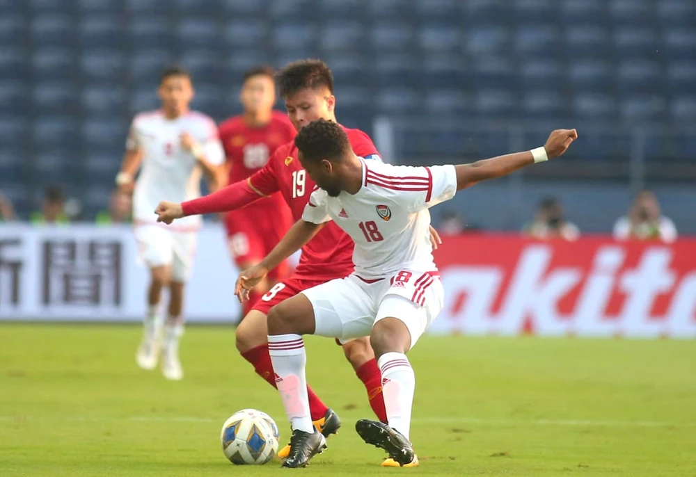Quang Hải đi bóng trước sự truy cản của cầu thủ U-23 UAE. Ảnh: TRÂM ANH