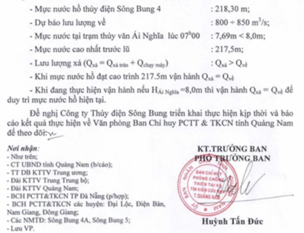 Công văn chỉ đạo xả lũ của ông Huỳnh Tấn Đức (Phó Trưởng ban Chỉ huy PCLB&TKCN tỉnh Quảng Nam).
