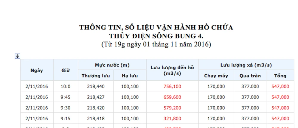 Được biết tính đến 10 giờ sáng 2-11, mực nước hồ thủy điện Sông Bung 4 ở thượng nguồn là 218,440 m, lưu lượng đến hồ 756,100 m3/s, tổng lưu lượng xả 547 m3/s, trong đó chạy 170 m3/s và qua tràn là 377 m3/s.