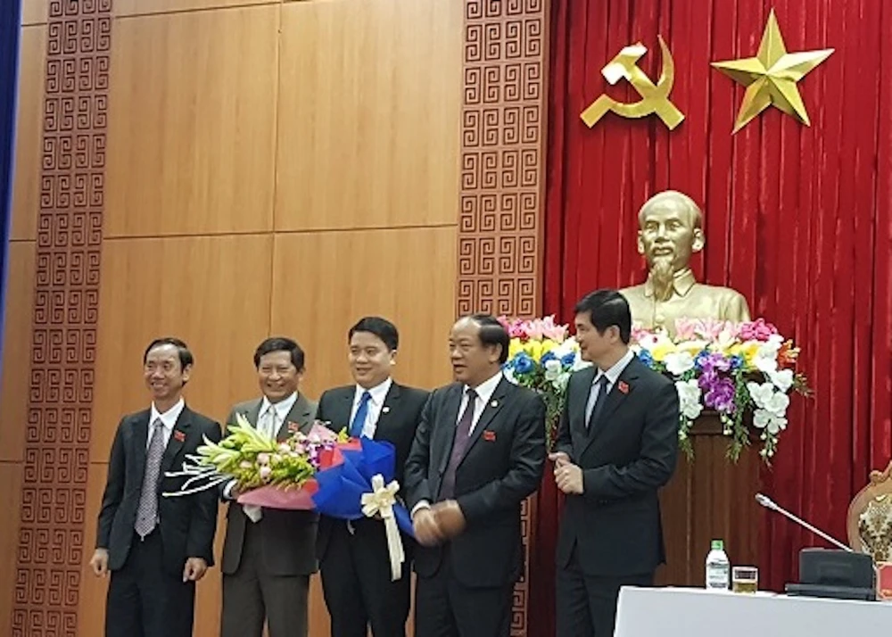 Ông Trần Văn Tân (ở giữa, ôm hoa) được bầu làm phó chủ tịch UBND tỉnh Quảng Nam ở tuổi 39. Ảnh: UBQN