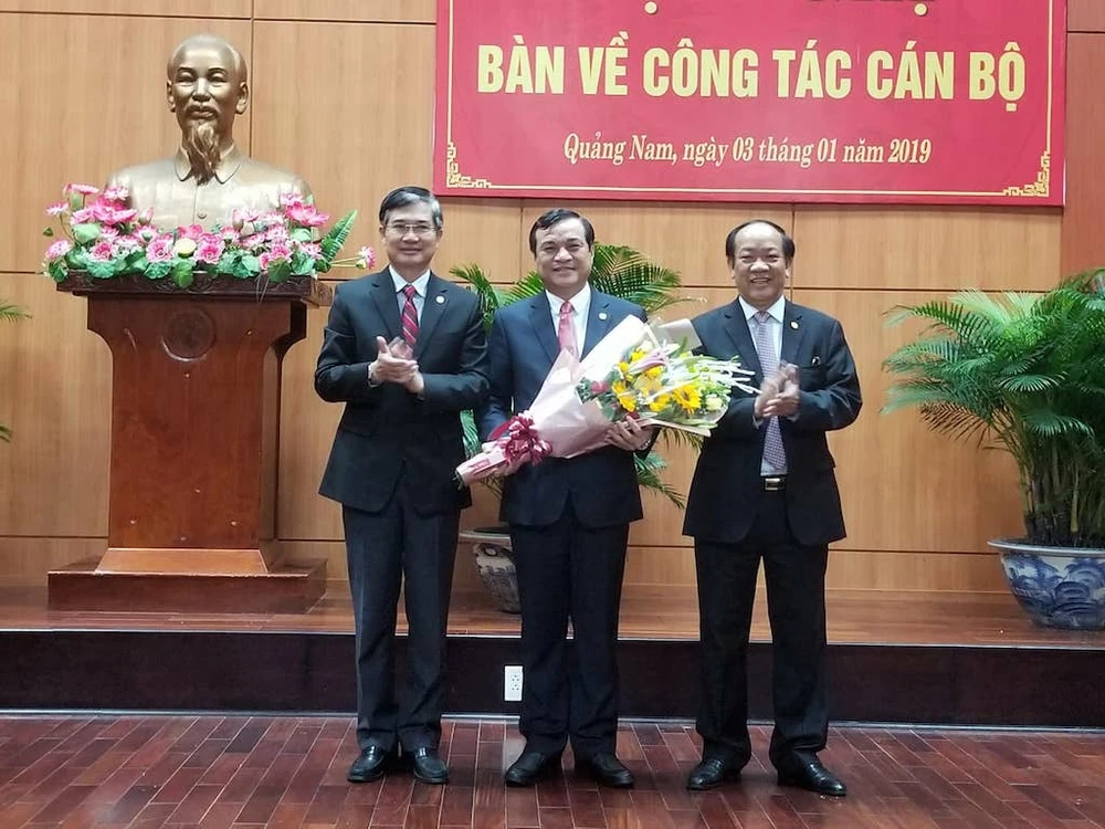 Ông Phan Việt Cường (cầm hoa, ở giữa) được bầu giữ chức Bí thư Tỉnh ủy Quảng Nam. Ảnh: THANH NHẬT.
