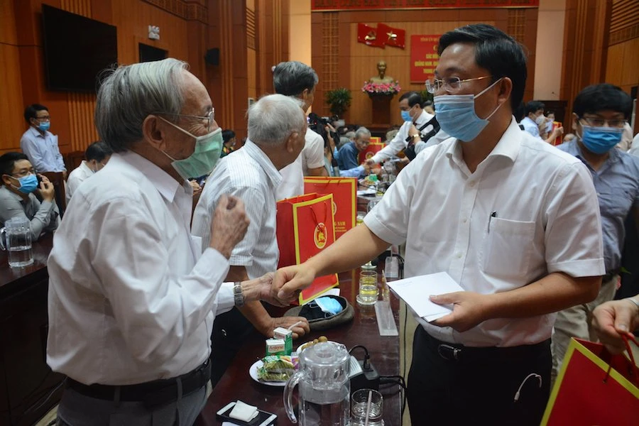 Ông Lê Trí Thanh, Chủ tịch UBND tỉnh Quảng Nam thăm hỏi, tặng quà lãnh đạo thế hệ trước. Ảnh: TN