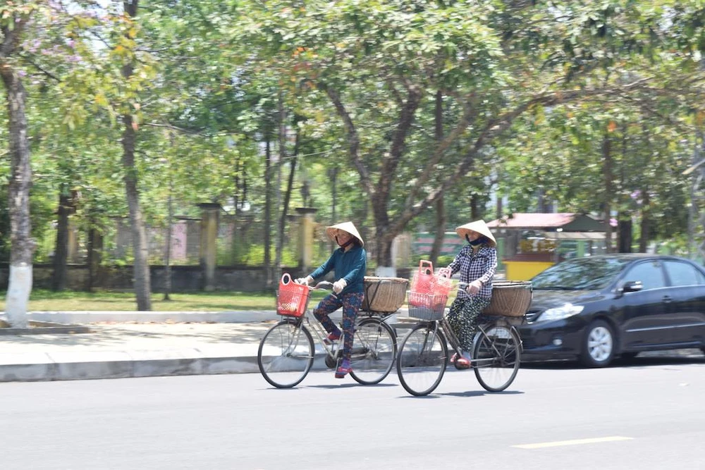 Người dân vội vã đạp xe giữa cái nắng như thiêu. Ảnh: THANH NHẬT.