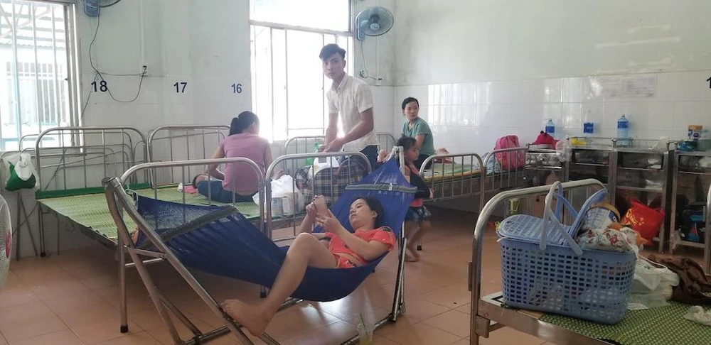 Phụ huynh mang võng vào trong bệnh viện để chăm sóc trẻ trong những ngày nắng nóng. Ảnh: THANH NHẬT