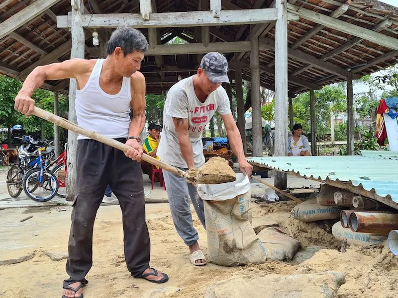Từ sáng 27-10, gia đình Nguyễn Thị Mau (66 tuổi, ngụ thôn Hà Bình, xã Bình Minh, huyện Thăng Bình, Quảng Nam) huy động con cái, người thân đổ cát vào bao dựng hầm tránh bão.