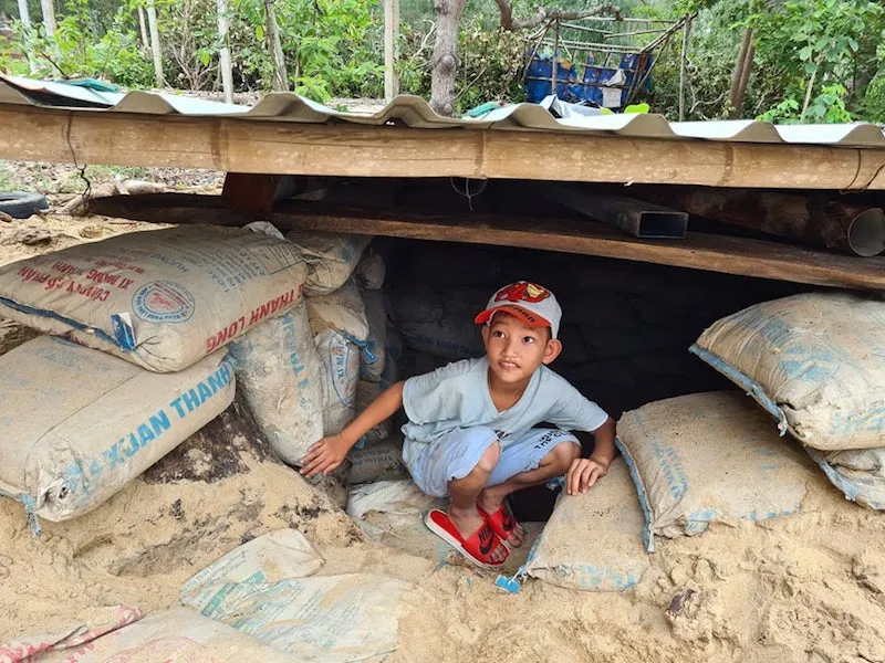 “Bình thường cháu tội lắm, nhưng sợ đến nhà họ, nơi đông người lỡ cháu lên cơn sẽ gây nguy hiểm cho mọi người xung quanh”, bà Mau chia sẻ lý do gia đình làm hầm tránh bão.